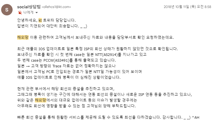 실제로 필자는 2018년도 iCloud에서 파일 다운로드가 실패하는 현상이 발생해 KT CS에 문의하였고, iOS 업데이트로 인해 해외망이 혼잡해 문제가 발생했다는 답변을 받았다.