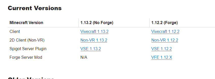 우선 Vivecraft 홈페이지에 가서 1.13.2용 Client 주소를 눌러줍니다. 아직 1.13.2는 Forge용으로는 없는 듯합니다.