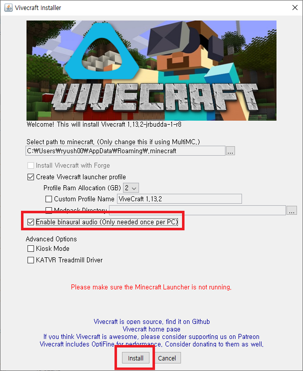 다시 바이브크래프트 설치 파일을 실행시키면 위와 같은 화면이 뜹니다. Enable binaural audio를 체크하시고 Install 버튼을 눌러주세요. 설치 시에는 마인크래프트 런쳐가 꺼져있어야 하며, 한 번이라도 1.13.2를 실행한 적이 있어야만 합니다.