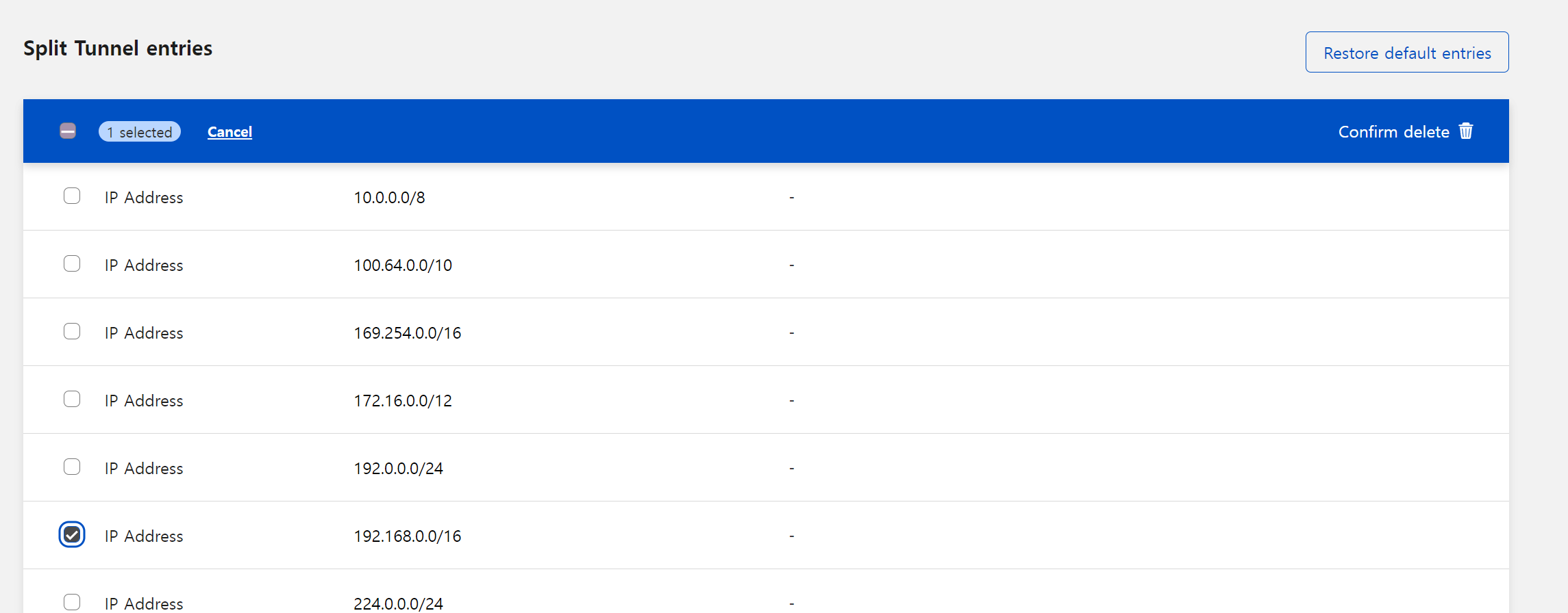 기본적으로 내부 네트워크 등은 VPN을 타지 않도록 설정이 되어있다. 우리는 내부 네트워크에 접속할 수 있어야 하기 때문에 192.168.0.0/16 대역을 지워주자.
